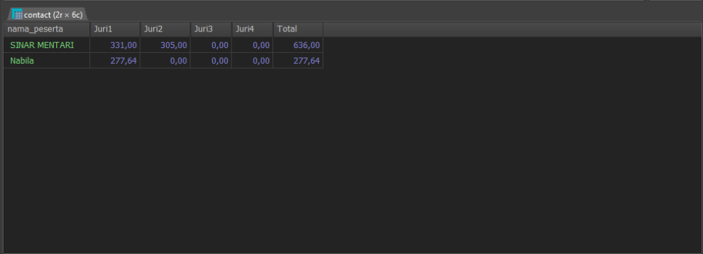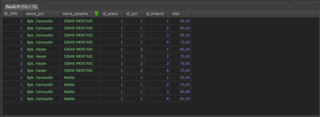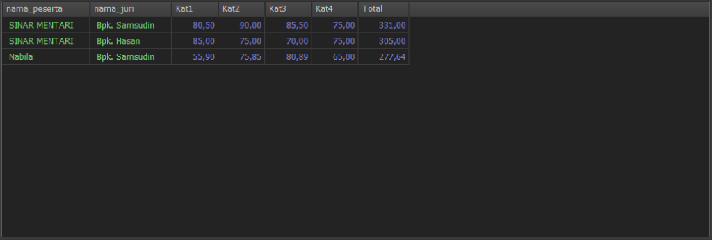 Sekarang kita buat query rekap nilai berdasarkan kriteria dan juri